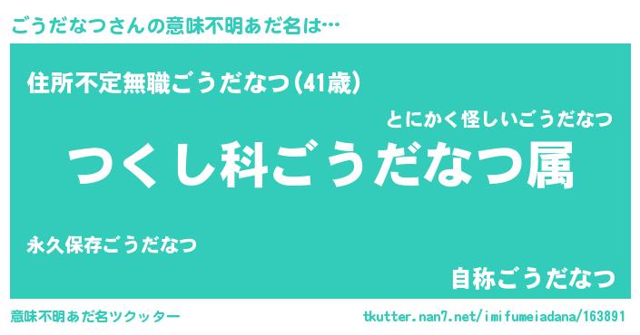 | 男性向けラノベタイトル風あだ名 | 『ごうだなつ~年齢イコール彼女いない歴の魔法使い~』 |
