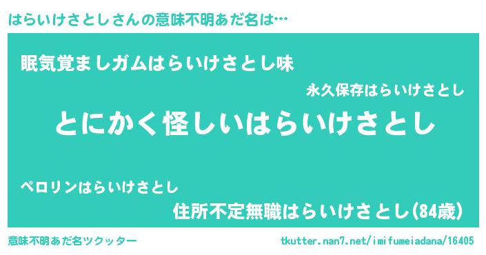 | 男性向けラノベタイトル風あだ名 | 『ダンジョンにはらいけさとしを求めるのは間違っているだろうか』 |