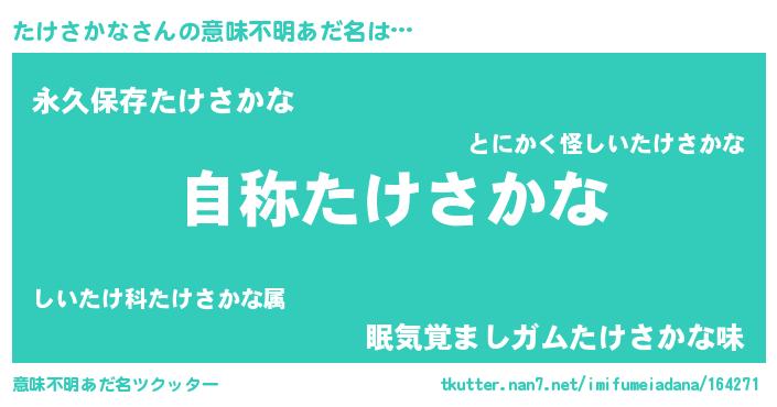 | 男性向けラノベタイトル風あだ名 | 『Re:たけさかなから始める異世界生活』 |