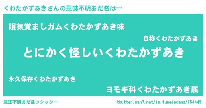 | 男性向けラノベタイトル風あだ名 | 『くわたかずあきの嫁は女の子じゃないと思った?』 |