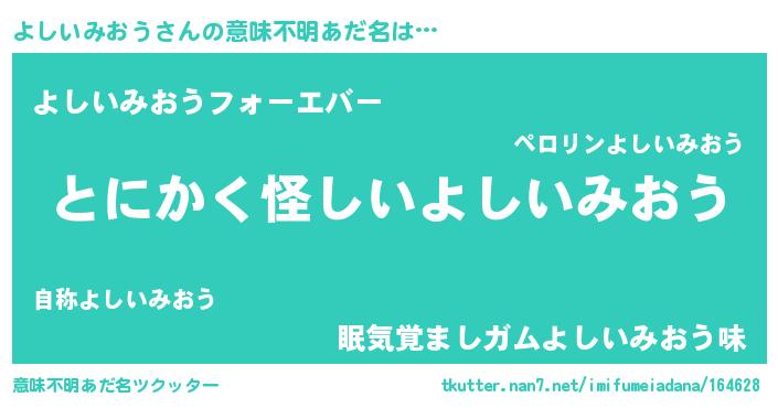 | 男性向けラノベタイトル風あだ名 | 『よしいみおうの嫁は女の子じゃないと思った?』 |