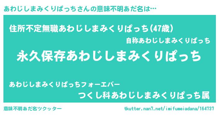 | 男性向けラノベタイトル風あだ名 | 『あわじしまみくりぱっちという概念が存在しない退屈な世界 』 |