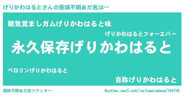 | 男性向けラノベタイトル風あだ名 | 『誰もが恐れるあのげりかわはるとが、ぼくの専属メイドになるようです。』 |