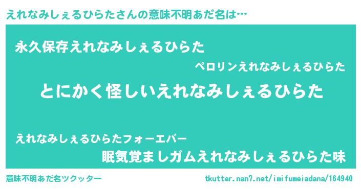 | 女子向けラノベタイトル風あだ名 | 『えれなみしぇるひらたは平凡を望む』 |