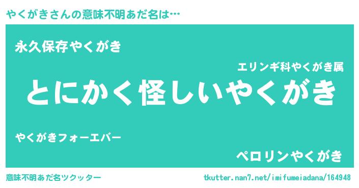 | 男性向けラノベタイトル風あだ名 | 『やくがきの嫁は女の子じゃないと思った?』 |
