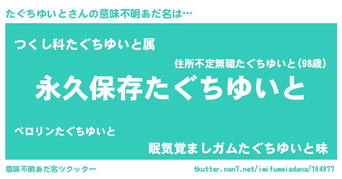 | ヘコむあだ名 | 『たぐちゆいと(遠い目)』『たぐふぇ~』 |