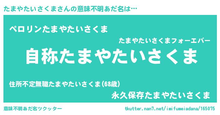 | 男性向けラノベタイトル風あだ名 | 『Re:たまやたいさくまから始める異世界生活』 |