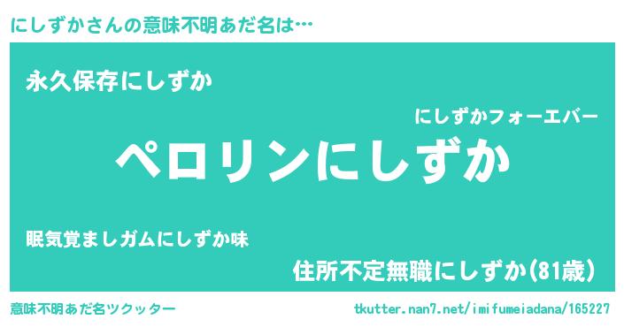 | 男性向けラノベタイトル風あだ名 | 『にしずかに滅ぼされるだけの簡単なお仕事です』 |