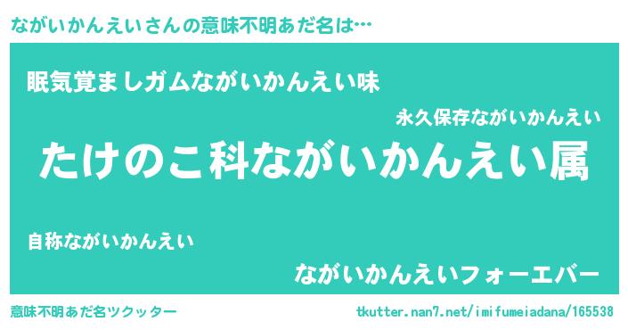 | 男性向けラノベタイトル風あだ名 | 『転生したらながいかんえいだった件』 |