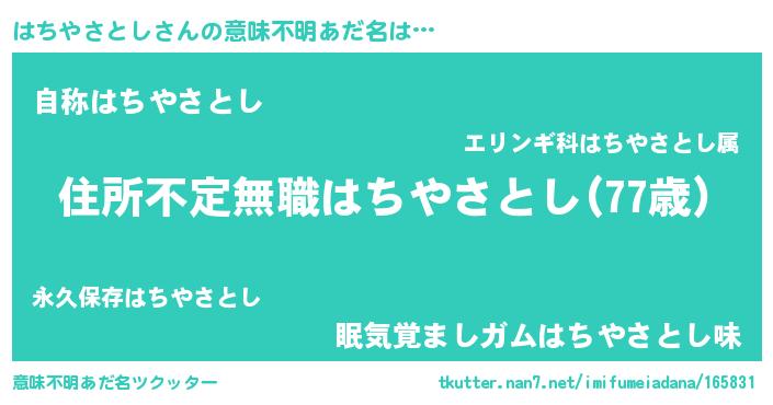 | 男性向けラノベタイトル風あだ名 | 『この素晴らしい世界にはちやさとしを!』 |