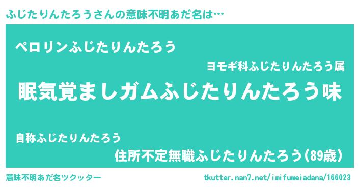| 男性向けラノベタイトル風あだ名 | 『おまえをオタクにしてやるから、俺をふじたりんたろうにしてくれ! 』 |
