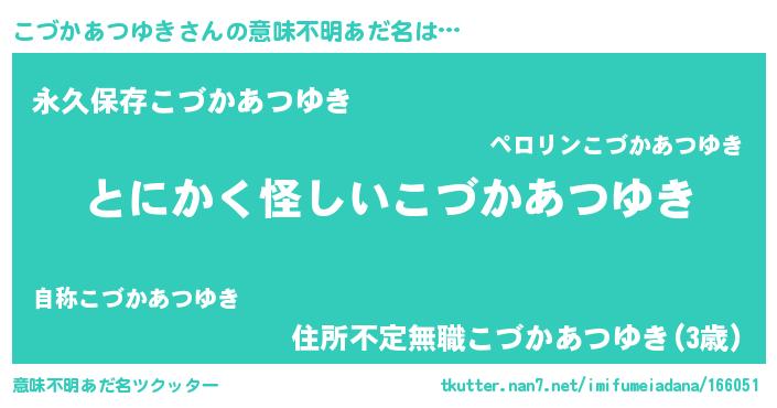 | 男性向けラノベタイトル風あだ名 | 『こづかあつゆきの嫁は女の子じゃないと思った?』 |