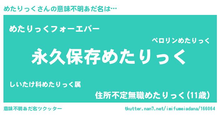 | 男性向けラノベタイトル風あだ名 | 『めたりっくという概念が存在しない退屈な世界 』 |