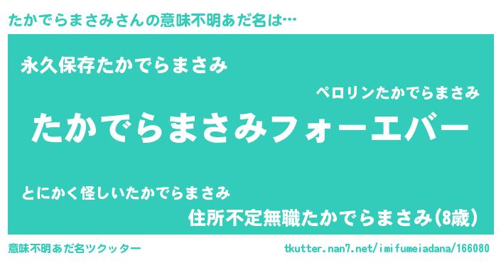 | 男性向けラノベタイトル風あだ名 | 『うちのたかでらまさみが世界を掌握している!』 |