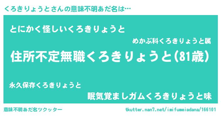 | 胡散臭い通販商品みたいなあだ名 | 『あなたにだけ特別に提供する世界で10本だけ現存している希少なブランデー…その名も「くろきりょうと」』 |