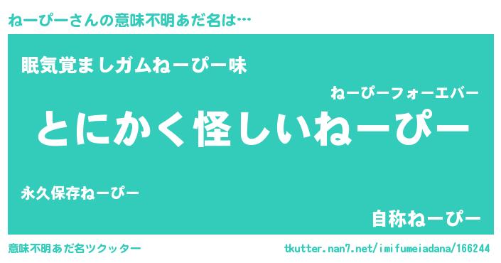 | 女子向けラノベタイトル風あだ名 | 『ねーぴーの卵を拾いまして』 |