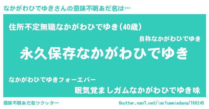 | 胡散臭い通販商品みたいなあだ名 | 『絶対に幸福をもたらす水素水…その名も「なかがわひでゆき」』 |