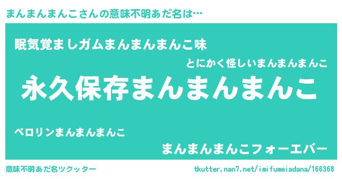 | 男性向けラノベタイトル風あだ名 | 『まんまんまんこという概念が存在しない退屈な世界 』 |