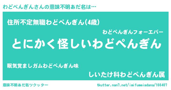 | 男性向けラノベタイトル風あだ名 | 『わどぺんぎんの嫁は女の子じゃないと思った?』 |