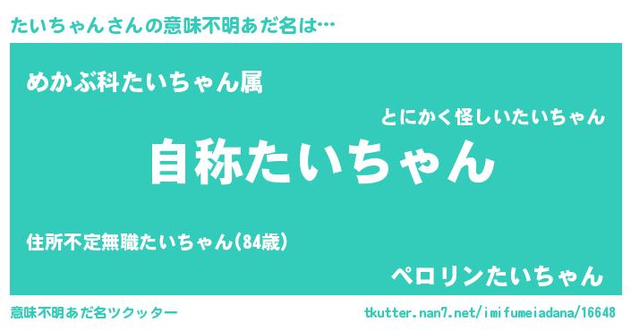 | 男性向けラノベタイトル風あだ名 | 『Re:たいちゃんから始める異世界生活』 |