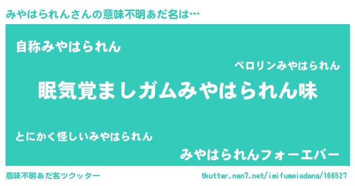 | 男性向けラノベタイトル風あだ名 | 『みやはられんに滅ぼされるだけの簡単なお仕事です』 |