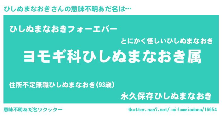 | 男性向けラノベタイトル風あだ名 | 『ひしぬまなおき~年齢イコール彼女いない歴の魔法使い~』 |