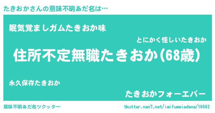| 男性向けラノベタイトル風あだ名 | 『この素晴らしい世界にたきおかを!』 |