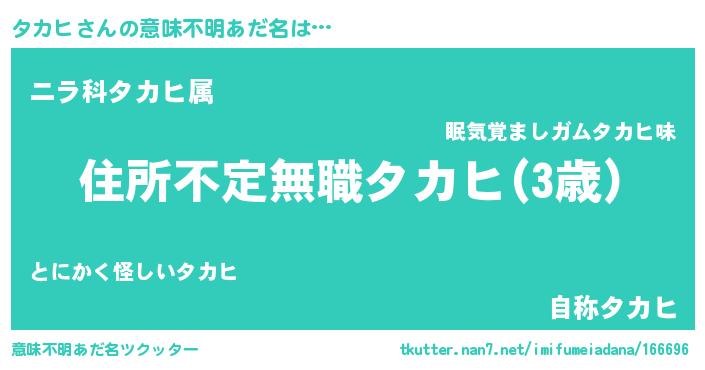 | 男性向けラノベタイトル風あだ名 | 『この素晴らしい世界にタカヒを!』 |