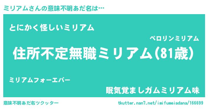 | 女子向けラノベタイトル風あだ名 | 『乙女ゲームの破滅フラグしかない悪役ミリアムに転生してしまった…』 |