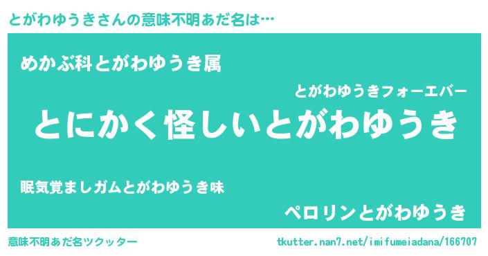 | ポケモン風あだ名 | 『ヒトガワユウキ』『トガキング』 |