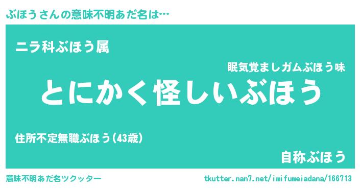 | 胡散臭い通販商品みたいなあだ名 | 『信頼と実績のサプリメント…その名も「ぶほう」』 |