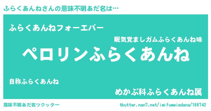 | 胡散臭い通販商品みたいなあだ名 | 『億万長者になれるブレスレット…その名も「ふらくあんね」』 |