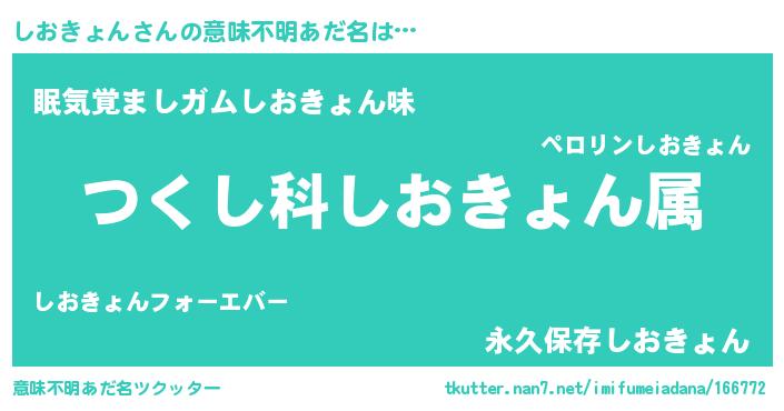 | 男性向けラノベタイトル風あだ名 | 『しおきょん~年齢イコール彼女いない歴の魔法使い~』 |