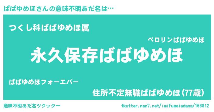 | 胡散臭い通販商品みたいなあだ名 | 『来世でも幸せになれる健康食品…その名も「ばばゆめほ」』 |