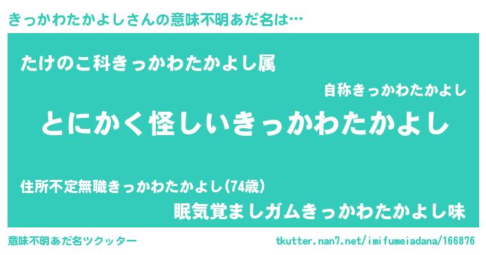 | 男性向けラノベタイトル風あだ名 | 『きっかわたかよしの嫁は女の子じゃないと思った?』 |