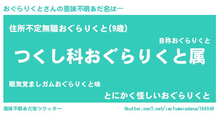 | 欧米人風あだ名 | 『おぐらりくと・ステッグマイヤー』 |