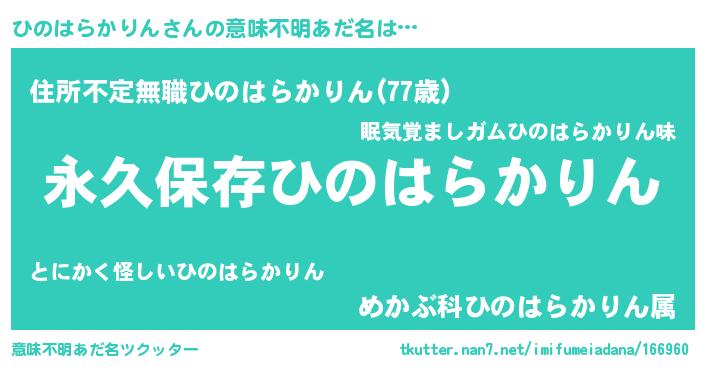 | 女子向けラノベタイトル風あだ名 | 『異世界で失敗しない100のひのはらかりん』 |