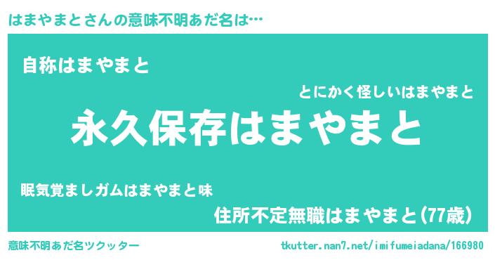 | 胡散臭い通販商品みたいなあだ名 | 『絶対に幸福をもたらす水素水…その名も「はまやまと」』 |