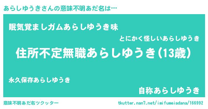 | 男性向けラノベタイトル風あだ名 | 『この素晴らしい世界にあらしゆうきを!』 |