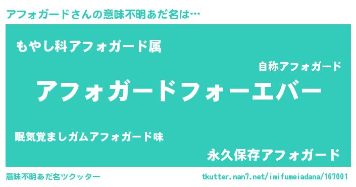 | 男性向けラノベタイトル風あだ名 | 『アフォガードに滅ぼされるだけの簡単なお仕事です』 |