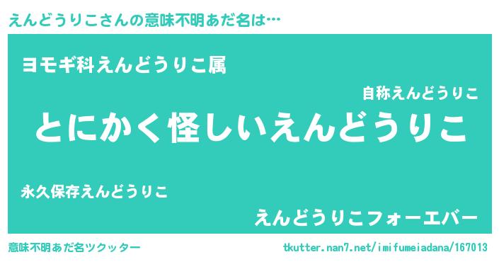 | 男性向けラノベタイトル風あだ名 | 『えんどうりこの嫁は女の子じゃないと思った?』 |