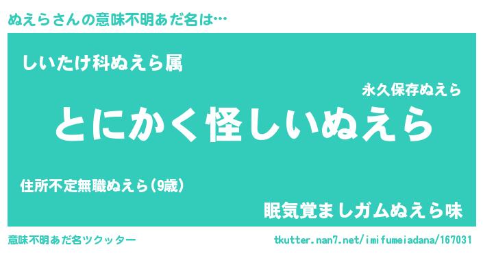 | 女子向けラノベタイトル風あだ名 | 『ぬえら様がみてる』 |
