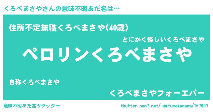 | 男性向けラノベタイトル風あだ名 | 『くろべまさやの憂鬱』 |