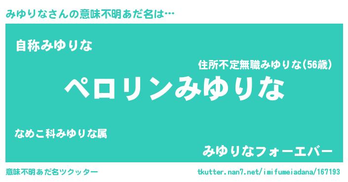 | 男性向けラノベタイトル風あだ名 | 『みゆりなの憂鬱』『魔弾の王とみゆりな』 |
