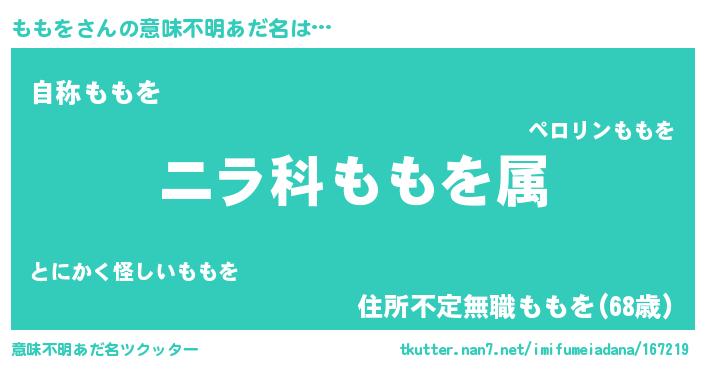 | 男性向けラノベタイトル風あだ名 | 『ももを~年齢イコール彼女いない歴の魔法使い~』 |