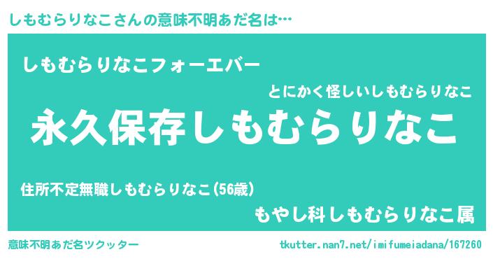 | 男性向けラノベタイトル風あだ名 | 『しもむらりなこという概念が存在しない退屈な世界 』 |