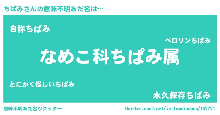 | 男性向けラノベタイトル風あだ名 | 『転生したらちぱみだった件』 |