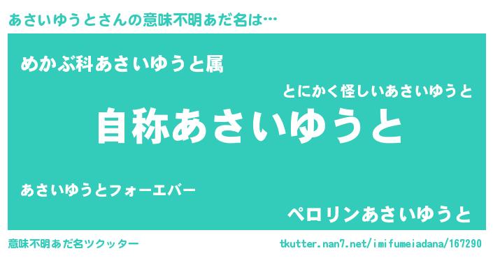 | 男性向けラノベタイトル風あだ名 | 『Re:あさいゆうとから始める異世界生活』 |