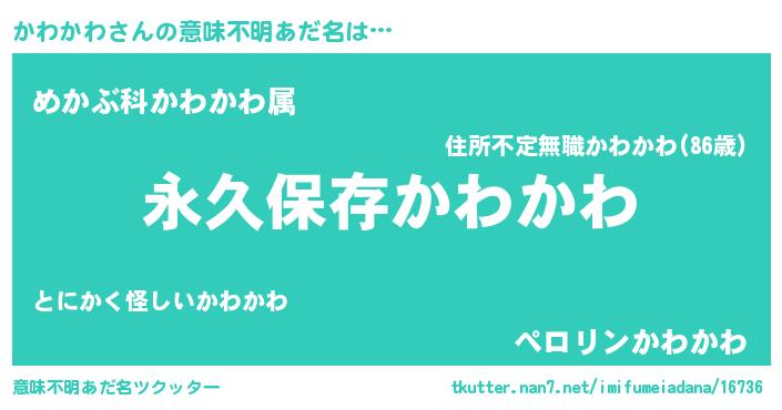 | 男性向けラノベタイトル風あだ名 | 『かわかわという概念が存在しない退屈な世界 』 |