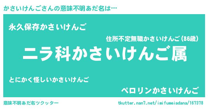 | 男性向けラノベタイトル風あだ名 | 『かさいけんご~年齢イコール彼女いない歴の魔法使い~』 |